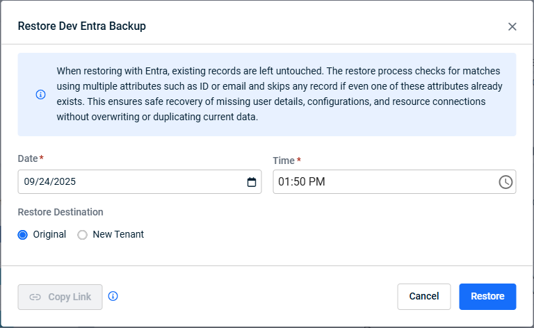 IMPORTANT BEFORE YOU RESTORE Restore skips existing Microsoft Entra ID records and any changes that have been made to existing records will not be restored. Instead, new records will be created only for records that do not exist at all in the target domain. New records will NOT be created for items that appear in the tenant's list of deleted records.