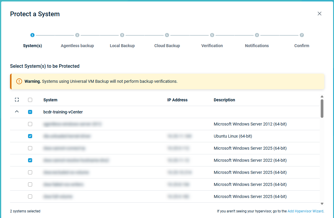 Once the Protect a System wizard opens, click Protect agentless system to create the pairing using the hypervisor host.