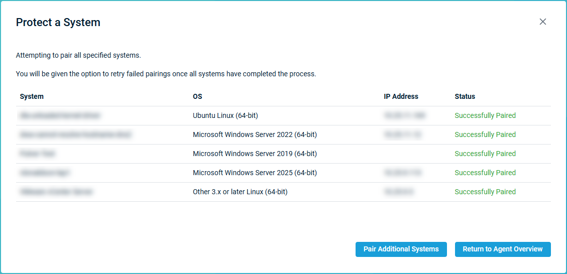 When the process is complete, you will see a Successfully Paired notification appear next to the selected system(s). You will also see a new entry for each agent on the Protect tab of the Remote Web when you click Return to Agent Overview.